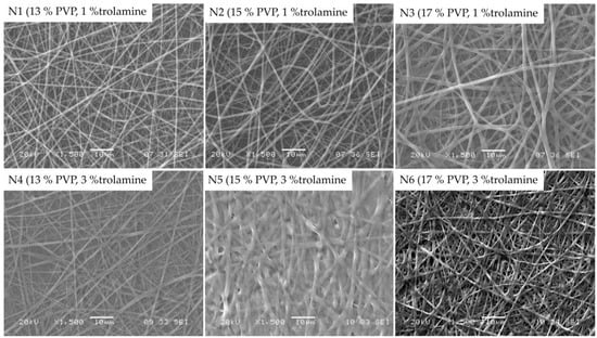 Morphology of the obtained nanofibers were examined by SEM. Figure 2 represents the SEM images of samples with 13%, 15% and 17% PVP content with different trolamine proportions, with 12.5 cm emitter to collector distance.