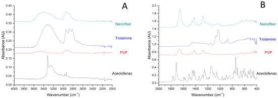 Expanded FT-IR spectra (A) 4000–2000 cm−1; (B) 2000–400 cm−1) of individual components and the nanofibrous formulation (composition N2: 10 mg/g aceclofenac, 15 w/w% PVP, 1 w/w% trolamine in ethanol:water 75:25 w/w%).