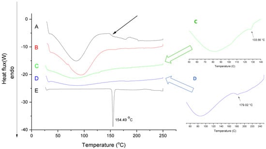 Differential scanning calorimetry (DSC)thermograms of the (A) nanofibrous formulation (composition N2 of polymeric solution: 10 mg/g aceclofenac, 15 w/w% PVP, 1 w/w% trolamine in ethanol:water 75:25 w/w%); (B) neat fiber; (C) physical mixture (same amount of PVP and aceclofenac as in composition N2); (D) PVP and (E) aceclofenac.