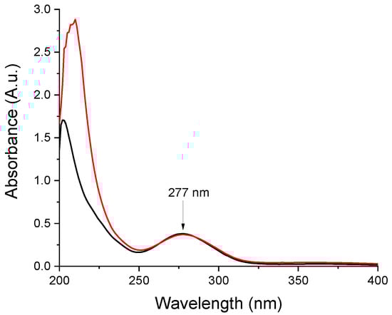Comparative UV spectra recorded of ethanolic solutions of-red trace-the nanofibrous formulation (composition N2 of polymeric solution: 10 mg/g aceclofenac, 15 w/w% PVP, 1 w/w% trolamine in ethanol:water 75:25 w/w%); black trace–neat aceclofenac.