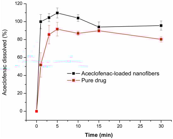 Figure 6 illustrates the obtained comparative dissolution profiles of the drug-loaded nanofibers (composition N2 of polymeric solution) and neat aceclofenac. As it can be observed, drug release is spontaneous from the nanofibrous webs and complete even at the first minute of the low volume dissolution test. Although, around 90% of the selected dose of the pure active substance dissolves throughout the dissolution test, the dissolution rate is slower in comparison to the nanofibrous formulation (51% and 85% at 1 min and 3 min, respectively). The faster dissolution rate of the fibrous formulation can be explained by the increased specific surface area of the nanofibers, the amorphous state of the active and the highly hydrophilic nature of the fiber-forming polymer.