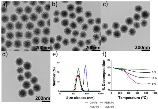 (a–d) TEM images of pristine DSNPs, PDSNPs, ADSNPs, and SDSNPs, respectively, showing dendritic morphology with pores radiating from the center; (e) particle size distribution showing that ADSNPs follow the trend of aggregation and remaining negatively charged DSNPs exhibit particle size at pH 7.4, agreeable with that of TEM imaging; (f) TGA of pristine and functionalized DSNPs.