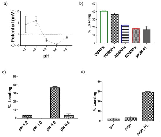 (a) ζ-potential profile of exenatide acetate at different pH confirming pI. (b) Loading of exenatide on different DSNPs and MCM-41, using pH 5.0 MES buffer, observed as maximum for pristine DSNPs. (c) Loading of exenatide on PDSNPs at different pH. (d) Effect of coating, chitosan in 0.1 M acetic acid solution (pH 3.8), strategies on exenatide loading. t = 0 and t = 90 shows the time interval at which chitosan was introduced into the exenatide loading solution. t = 90, PL (post loading) stands for the technique in which loaded particles were separated before the coating step. (All data are n = 3, Mean ± SD).