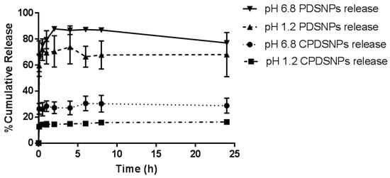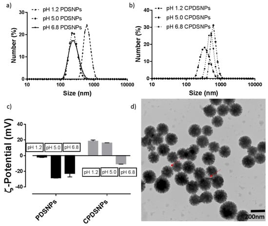 Chitosan-coated PDSNPs demonstrated a higher hydrodynamic diameter of ~740 nm (PDI: 0.5) at pH 6.9, while at pH 1.2 (PDI: 0.17) they appeared to be relatively dispersed with a size of 340 nm. A larger hydrodynamic diameter could be associated with amine groups which are less protonated at pH 6.8, leading to weak electrostatic interactions and aggregation [52]. This finding also coincides with ζ-potential findings for medium–high molecular weight chitosan of −11 mV at pH 7.0 [53]. A lower ζ-potential value also correlates with exposure of negatively charged particles due to the weakening electrostatic interactions at pH 6.8. Coating of chitosan was evident by reversal in ζ-potential of PDSNPS from −25 to +20 mV (pH 1.2 and 5.0), via TEM and TGA analysis (Figure 3, Figure S3).