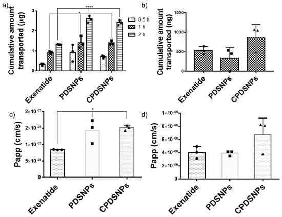 (a) Cumulative amount of exenatide transported through the Caco-2 monolayer at 0.5, 1, and 2 h, where monolayers were incubated with 40 µg/mL exenatide solution and equivalent exenatide-loaded nanoparticles (all data are n = 3, mean ± SD, and analyzed by one-way ANOVA, post-hoc Tukey’s test, * p < 0.05, **** p < 0.0001) (b) Cumulative amount of exenatide transported through the triple co-culture model at 2 h, where the cellular barrier was incubated with 40 µg/mL exenatide solution and equivalent exenatide-loaded nanoparticles. (c) Apparent permeability coefficient (Papp) of exenatide from PDSNPs and CPDSNPs at 2 h in the Caco-2 monolayer (all data are n = 3, mean ± SD, and analyzed by one-way ANOVA, post-hoc Tukey’s test, * p < 0.05). (d) Apparent permeability coefficient (Papp) of exenatide from PDSNPs and CPDSNPs at 2 h in (d) the triple co-culture model (all data are n = 3, mean ± SD).