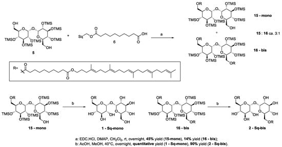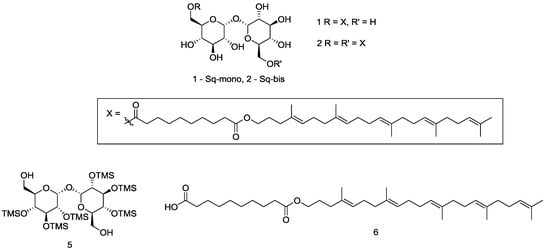 In order to obtain either a mono-(target compound 1-Sq-mono, 1:1 squalene-trehalose conjugate) and a bis-squalenylated trehalose construct (target compound 2-Sq-bis, 2:1 squalene-trehalose conjugate), we focused our attention onto the hexaTMS-protected trehalose derivative 5 [] and the carboxylated squalene-linker adduct 6 [] (Figure 2).