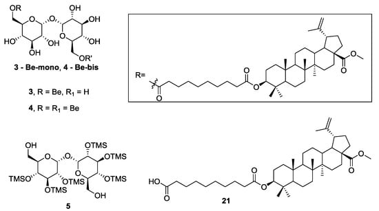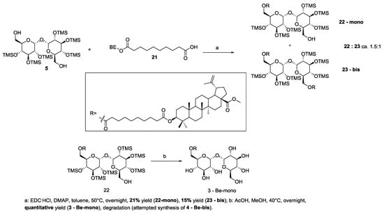 In order to obtain the target 3-Be-mono betulinic acid-trehalose conjugate we adopted a similar strategy, focusing our attention onto the same hexaTMS-protected trehalose derivative 5 [] and the carboxylated betulinic-linker adduct 21 (Figure 3).