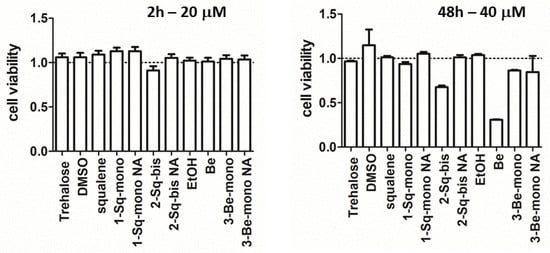 Cytotoxicity assay on betulinic acid, squalene, 1-Sq-mono, 2-Sq-bis, 3-Be-mono, mono-Sq-NA1, bis-Sq-NA2 and mono-Be-NA3. MTT assay, 2 h/20 μM (left) and 48 h/40 μM (right), trehalose = 100 mM.