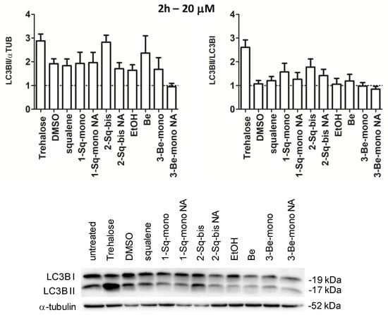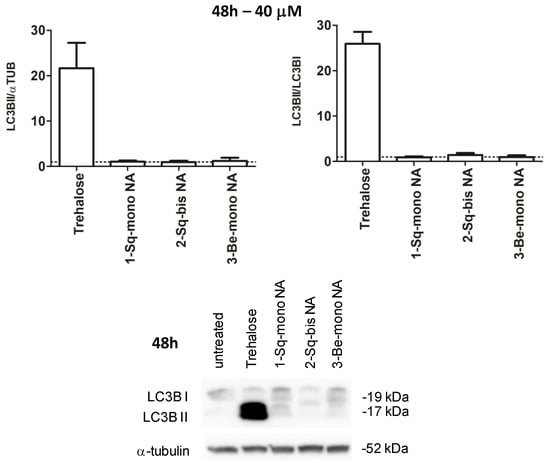 The three NAs did not show any cytotoxicity, supporting their testing in the autophagy induction assay. The three mono-Sq-NA1, bis-Sq-NA2 and mono-Be-NA3 NAs did not show any effect upon autophagy induction; their inactivity could be justified by the absence of μM-free trehalose in cell lysates (LC-MS determination), possibly due to limited degradation of NAs in 48 h.