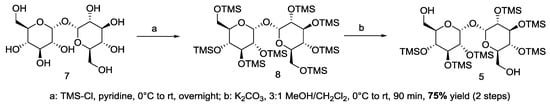 HexaTMS-protected trehalose 5 was obtained through per-silylation of commercially-available trehalose 7 with TMS-Cl (per-silylated 8, step a), followed by a selective deprotection of primary, more easily accessible, hydroxyls (step b, Scheme 1).