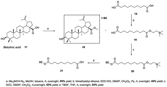 Betulinic acid 17 was first esterified (methyl ester 18, step a), then coupled with mono-protected diacid 19 (prepared by a controlled esterification of sebacic acid 14, step b) to provide silyl-protected construct 20 (step c). Carboxylic acid deprotection finally provided target carboxylated betulinic-linker adduct 21 (step d, Scheme 4).