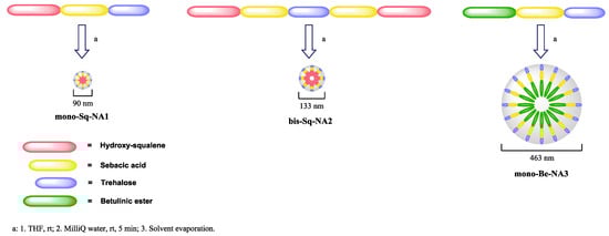 Both 1-Sq-mono and 2-Sq-bis squalene-trehalose conjugates, and 3-Be-mono betulinic acid-trehalose conjugate were assembled into their corresponding NAs (mono-Sq-NA1, left, bis-Sq-NA2, middle, and mono-Be-NA3, right, Scheme 6) following a standard experimental protocol [].