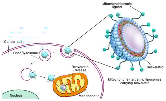 Mitochondria are membrane-enclosed organelles present in most eukaryotic cells, described as “power houses of the cell”. The mitochondria can be a target for inducing cancer cell death and for developing strategies to bypass multi drug resistance (MDR) mechanisms. 4-Carboxybutyl triphenylphosphonium bromide-polyethylene glycol-distearoylphosphatidylethanolamine (TPP-DSPE-PEG) and dequalinium-polyethylene glycol-distearoylphosphatidylethanolamine (DQA-DSPE-PEG) were synthesized as mitochondriotropic molecules. Mitochondria-targeting liposomes carrying resveratrol were constructed by modifying the liposome’s surface with TPP-PEG or DQA-PEG, resulting in TLS (Res) and DLS (Res), respectively, with the aim to obtain longer blood circulation and enhanced permeability and retention (EPR). Both TLS (Res) and DLS (Res) showed dimensions of approximately 120 nm and a slightly positive zeta potential. The enhanced cellular uptake and selective accumulation of TLS (Res) and DLS (Res) into the mitochondria were demonstrated by behavioral observation of rhodamine-labeled TLS or DLS, using confocal microscopy, and by resveratrol quantification in the intracellular organelle, using LC–MS/MS. Furthermore, TLS (Res) and DLS (Res) induced cytotoxicity of cancer cells by generating reactive oxygen species (ROS) and by dissipating the mitochondrial membrane potential. Our results demonstrated that TLS (Res) and DLS (Res) could provide a potential strategy to treat cancers by mitochondrial targeting delivery of therapeutics and stimulation of the mitochondrial signaling pathway.