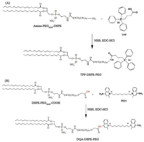Synthesis scheme of TPP-DSPE-PEG (A) and DQA-DPPE-PEG (B) conjugate. DSPE-PEG2000-COOH, 1,2-distearoyl-sn-glycero-3-phosphoethanol-amine-N-[methoxy(polyethylene glycol)-2000-COOH] and DQA-DPPE-PEG, dequalinium-polyethylene glycol-distearoylphosphatidylethanolamine; TPP-DSPE-PEG, 4-carboxybutyl triphenylphosphonium bromide- polyethylene glycol-distearoylphosphatidylethanolamine.