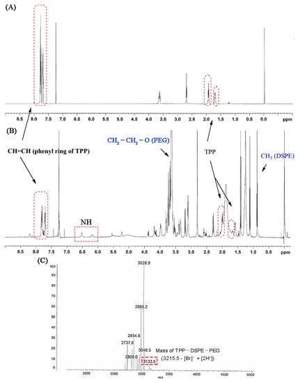 TPP-DSPE-PEG formation was confirmed by the proton NMR spectrum. The appearance of signals at 7.46–7.76 ppm was attributed to the presence of CH=CH and the phenyl ring of TPP and signals at 2.66, 2.0 and 1.6 ppm were attributable to the methylene group of the carboxy butyl linker. Signals at 6 and 6.5 ppm appeared due to the presence of the NH group in the conjugate. In addition, the major signals of DSPE-PEG (at 3.7 ppm for –CH2–CH2–O of PEG and at 1–3.5 ppm and 0.85 ppm for methylene and the methyl groups in the lipid chain, respectively) in the proton NMR spectrum also indicated the formation of the conjugate (Figure 3A,B). The MALDI-TOF spectrum showed a peak at 3133.5 m/z that was assigned to TPP-DSPE-PEG (M-[Br−] + [2H+]; Figure 3C). The MALDI-TOF assay results also clearly confirmed the graft reaction of TPP to DSPE-PEG.