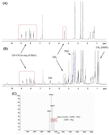 The formation of DQA-DSPE-PEG was confirmed by the proton NMR spectrum. The appearance of signals at 7.7–9.0 ppm and 4.4 ppm were attributed to the presence of CH=CH in the aromatic ring and amine group of DQA, respectively, and signals at 1.2–3.5 ppm were attributable to the methylene group of the aliphatic chain between the two quinolines. Upon formation of the conjugate and the consequent creation of a NH group, a new signal at 6 ppm appeared. In addition, the major signals of DSPE-PEG (at 3.5 ppm for –CH2–CH2–O of PEG, at 1–3.7 ppm and 0.8 ppm for methylene and the methyl groups in the lipid chain, respectively) in the proton NMR spectrum also indicated the formation of the conjugate (Figure 4A,B). MALDI-TOF spectrum showed a peak at 3342.6 m/z that was assigned to DQA-DSPE-PEG (M-[NH2]; Figure 4C). The MALDI-TOF assay results also clearly confirmed the graft reaction of DQA to DSPE-PEG.