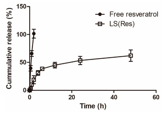 Percentage of cumulative release of free resveratrol and LS (Res) in PBS (pH 7.4). Mean ± S.E.M, n = 3.