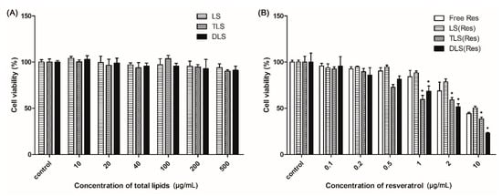 In vitro viability of B16F10 cells after applying the liposomes (A) non-carrying resveratrol and (B) carrying resveratrol at 24 h. Mean ± S.E.M, n = 4. * indicates a statistical difference from the LS (Res), p < 0.05.