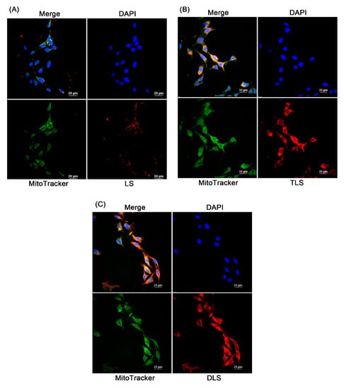 Cellular uptake of the non-targeting liposomes without resveratrol (LS) and mitochondrial-targeting liposomes without resveratrol (TLS and DLS) in B16F10 cells. Laser scanning confocal microscopy (LSCM) images after a 1 h of incubation with LS (A), TLS (B) and DLS, and (C) red, rhodamine-labeled liposome; green, MitoTracker; blue, 4′,6-diamidino-2-phenylindole (DAPI).