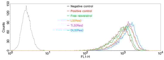 To determine the effect of resveratrol delivered by mitochondrial-targeting liposomes, we evaluated the ROS generation in the B16F10 cells treated with the free resveratrol, LS (Res), TLS (Res) and DLS (Res) after 12 h of incubation in the presence of the DCFH-DA reagent using FACS. The DCFH-DA fluorescent dye was used as it is transformed into 2,7-dichlorofluorescein upon ROS generation. The positive control was used as a standard of occurring change in the ROS production. As shown in Figure 9, fluorescence intensity of LS (Res), TLS (Res) and DLS (Res) increased more than that of free resveratrol in B16F10 cells after 12 h incubation, indicating that liposome formulations generated greater intracellular ROS levels compared to free resveratrol. The mean of fluorescence intensity in each group was calculated as TLS (Res; 1024.5 ± 12.3), DLS (Res; 1799.1 ± 14.9), LS (Res; 842.2 ± 7.9), free resveratrol (705.3 ± 17.1) and positive control (619.3 ± 25.1). TLS (Res) and DLS (Res) generated 1.2- and 2.1-fold greater ROS levels than LS (Res) did. In contrast, no ROS was generated in the control cells without drug treatment. ROS production in the mitochondria is closely associated with cell damage, such as inflammation, oxidative stress and cell organelle disruption [50,51,52].