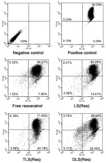 To evaluate the mitochondrial depolarization, flow cytometry studies with JC-1 dye staining were performed in B16F10 cells treated with free resveratrol, LS (Res), TLS (Res) and DLS (Res) for 12 h. A switch from the red to green fluorescence of the JC-1 dye indicated depolarization. The negative control and positive control indicate cells stained without and with JC-1, respectively. The two control cells were incubated in only serum free media for 12 h. The positive control presents only JC-1-stained the cells without any treatments. The degree of mitochondria depolarization was evaluated by moved events from the upper right to lower right section of the diagrams. As shown in Figure 10, the percentage of mitochondrial membrane depolarization was 7.95% ± 1.32%, 13.41% ± 2.95%, 24.78% ± 4.19% and 32.45% ± 3.07% in the free resveratrol, LS (Res), TLS (Res) and DLS (Res)-treated cells, respectively. The mitochondrial membrane potential (ΔΨm) of the TLS (Res) and DLS (Res)-treated cells was 1.8- and 2.4- fold higher than that of the LS (Res)-treated cells. The TLS (Res) and DLS (Res)-treated cells had the biggest dissipation of ∆Ψm, indicating that the mitochondria-specific targeting of resveratrol, by TPP and DQA moieties on the liposomes’ surface, triggered the increased dissipation of ∆Ψm. It was reported that ROS production can be triggered by mitochondria dysfunction [53] and excess levels of ROS in the cells cause damage to cellular organelles, which can lead to activation of apoptosis [54,55]. The mitochondrial membrane depolarization is the result of mitochondrial dysfunction, which leads to cell death via initiation of the apoptotic pathway.