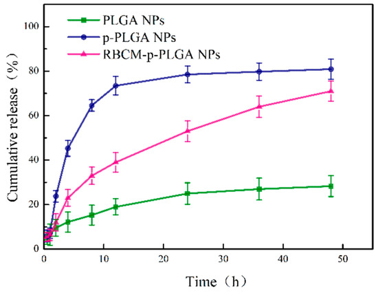 The release of Cur from PLGA@Cur, p-PLGA@Cur and RBCM-p-PLGA@Cur NPs at pH 7.4. Data are shown as mean ± S.D. (n = 4).