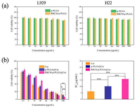 MTT viability data for (a) L929 cells and H22 cells treated with p-PLGA and RBCM-p-PLGA; (b) H22 cells treated with free Cur, p-PLGA@Cur NPs and RBCM-p-PLGA@Cur NPs. Data are presented as mean ± S.D. (n = 9). Statistical significance is denoted as * p < 0.05, ** p < 0.005 and *** p < 0.001.
