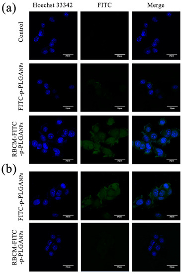 Confocal laser scanning microscopy (CLSM) images of (a) H22 cells and (b) RAW 264.7 cells exposed to FITC-p-PLGA and RBCM-FITC-p-PLGA NPs. Representative images from three independent experiments are shown.