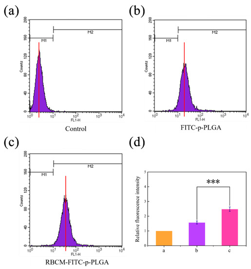 Flow cytometry data for (a) untreated H22 cells, and H22 cells incubated for 4 h with FITC labeled (b) p-PLGA NPs or (c) RBCM-p-PLGA NPs. (d) The relative fluorescence intensity values calculated from panels (a–c). The data are represented as mean ± S.D. (n = 3). *** p < 0.001.
