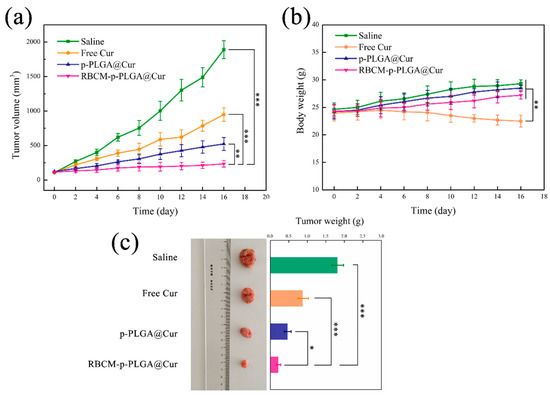 Changes in body weight were also monitored (Figure 6b). Free Cur treatment led to notably decreased body weights, with the animal weights reduced by ca. 6.1 ± 1.2% at the end of the treatment period. This indicates off-site toxicity and side effects arose. The mice in the NP treatment groups experienced an increase in body weight with time, but this effect is smaller with the RBCM-p-PLGA@Cur treatment group. The RBCM coating appeared to permit targeting to the tumor, thus avoiding systemic toxicity from free Cur. Considering the saline group, the body weight of the mice increased significantly over the experimental period, presumably because of the growth of the tumor. After sacrifice at the end of the experiment, the tumors were excised and weighed (Figure 6c); the masses were in the order saline > free Cur > p-PLGA@Cur NPs > RBCM-p-PLGA@Cur NPs. Again, the mass of the tumors in the mice treated with the RBCM-coated NPs was significantly less (p < 0.05) than that seen with the other treatment groups. This is in accordance with the in vivo tumor volume data.