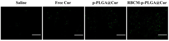 Histological analysis to assess tumor cell apoptosis was performed using an immunofluorescent TUNEL staining assay. The results are presented in Figure 7. In the animals that received pure Cur or the p-PLGA@Cur NPs, some green (apoptotic) cells were seen, but apoptosis was much more evident in the RBCM-p-PLGA@Cur NP treatment group. These in vivo results clearly show that the RBCM-p-PLGA@Cur NPs can act as an efficient drug delivery platform for tumor suppression.
