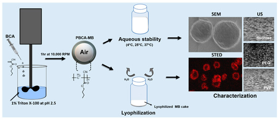 PBCA-MB have been explored for various imaging and drug delivery purposes [6,7,8]. PBCA is a biodegradable polymer and is FDA-approved as a surgical superglue for wound closing [9,10,11,12]. The shell of PBCA-MB is composed of relatively small-sized polymer chains, with an average molecular weight (Mn) of 4 kDa and with more than 99% of the chains below 40 kDa. The diameter of PBCA-MB typically is around 2 µm, and the shell thickness can be varied from ~50 to ~300 nm [13]. This relatively thick shell enables stable encapsulation of air, preventing diffusion into dispersion media, such as the blood upon i.v. administration [14]. In addition, the much thicker shell of PBCA-MB as compared to lipidic MB (~3–5 nm) allows for more efficient and more stable shell-loading with contrast agents, fluorescent dyes, and drug molecules [6,7,8].