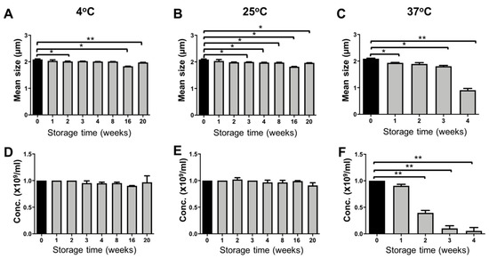 Figure 2. Storage stability of PBCA microbubbles. The average size and concentration (number of MB ×109 per mL) of PBCA-MB stored at 4 °C, 25 °C, and 37 °C were monitored for up to 20 weeks (AF). For samples kept at 37 °C, significant decreases in size and concentration were observed from week 4 and week 2 onwards, respectively (C, F). Values represent average ± SD of three different batches, measured in triplicates. * and ** indicates p < 0.05 and p < 0.005, respectively.