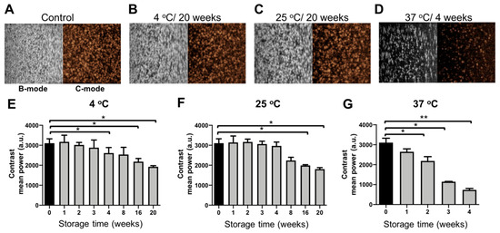 Figure 3. Acoustic properties of PBCA microbubbles upon storage. Representative bright mode (B-mode) and contrast mode (C-mode) US images of freshly prepared control PBCA-MB and PBCA-MB stored at 4 °C, 25 °C, and 37 °C for up to 20 weeks (AD). Quantification of the US images revealed no significant differences in backscatter signals when MB were stored at 4 °C and 25 °C (E,F). For samples stored at 37 °C, the acoustic signals decreased significantly from week 1 onwards (G). Values represent average ± SD of three different batches, measured in triplicates. * and ** indicates p < 0.05 and p < 0.005, respectively.