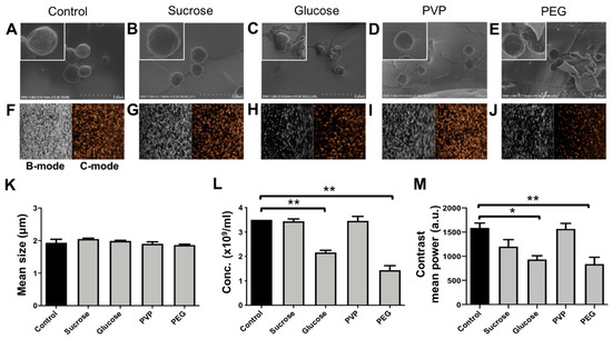 Figure 4. Lyophilization of PBCA microbubbles with different cryoprotectants. Representative SEM imaging (AE) of freshly prepared control PBCA-MB, and PBCA-MB lyophilized with 5% sucrose, glucose, polyvinylpyrrolidone (PVP), and polyethylene glycol (PEG). Representative bright mode (B-mode) and contrast mode (C-mode) US images of non-lyophilized control PBCA-MB and PBCA-MB lyophilized with 5% sucrose, glucose PVP, and PEG (FJ). The impact of lyophilization on MB size, concentration, and acoustic signal generation as compared with non-lyophilized control MB show that sucrose and PVP are suitable cryoprotectants for freeze-drying PBCA-MB (KM). Values represent average ± SD of three different batches, measured in triplicates. * and ** indicates p < 0.05 and p < 0.005, respectively.