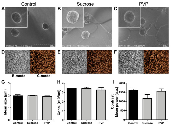 Figure 5. Characterization of dye-loaded PBCA-MB before and after lyophilization. Representative SEM images of non-lyophilized control rhodamine-B (Rho) PBCA-MB versus Rho-PBCA-MB lyophilized using 5% sucrose and 5% PVP indicating no changes in surface morphology (AC). Representative bright mode (B-mode) and contrast mode (C-mode) US images of non-lyophilized control PBCA-MB versus PBCA-MB lyophilized with 5% sucrose and PVP (DF). Lyophilization did not affect the size and concentration of Rho-PBCA-MB as compared to fresh non-lyophilized control Rho-PBCA-MB samples (G,H). Quantification of the US backscatter showed only very slight changes in US signal generation between non-lyophilized and Rho-PBCA-MB lyophilized with 5% sucrose whereas no change in case of Rho-PBCA-MB lyophilized with 5% PVP (I). Values represent average ± SD of three different batches, measured in triplicates.