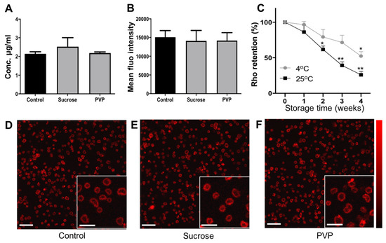 Figure 6. Dye retention in lyophilized PBCA-MB. No change in rhodamine-B (Rho) concentration was detected post lyophilization of Rho-PBCA-MB when compared to the initial concentrations (A). Quantification of STED microscopy images confirmed no significant change in the mean fluorescence intensity of lyophilized Rho-PBCA-MB compared to that of non-lyophilized control PBCA-MB (B). Quantification of Rho retention in non-lyophilized PBCA-MB showed a gradual decrease in rhodamine amounts from the first week of incubation at 4 °C and 25 °C onwards (C). Representative STED images of non-lyophilized control Rho-PBCA-MB and Rho-PBCA-MB lyophilized using sucrose and PVP (DF). Scale bars represent 10 μm for the large image and 5 μm for the insets. Values represent average ± SD of three different batches, measured in triplicates. * and ** indicates p < 0.05 and p < 0.005, respectively.