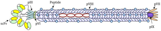 Although practically every filamentous bacteriophage coat protein can be used to display foreign amino acidic sequences, the pVIII protein is the most used for the expression of exogenous peptides in high copy number. The pIII protein, instead, has been successfully used for the expression of up to five copies per virion of the receptor-ligand and single-chain antibody fragment (scFv) [6] (Figure 1).