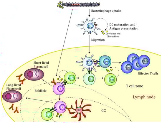 Filamentous bacteriophage nanovaccine can stimulate the humoral response or be taken up by antigen-presenting cells (APCs). The displayed antigenic peptides are processed and presented on MHCI and II molecules, leading to a CD4 and CD8 immune response. The presence of CpG sequences into the phage genome drives to APC maturation. GC (Germinal Center); FDC (Follicular Dendritic Cell). The figure depicts the possible scenario of target mediated fd internalization based on scientific results reported in [39,49].