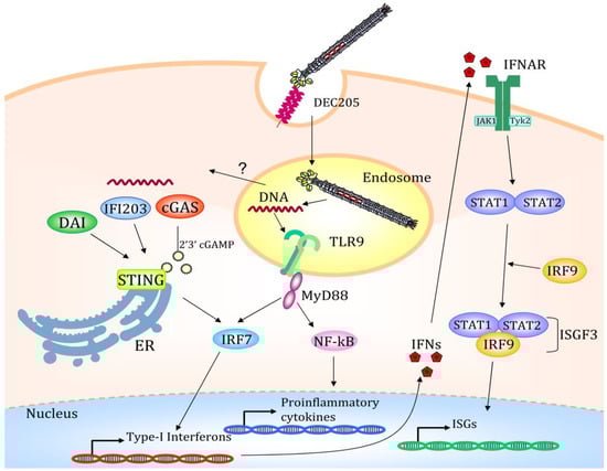 Once internalized via the DEC205 endocytic receptor, the filamentous bacteriophage is directed to the late endosomal compartments. Here the bacteriophage coat is degraded, and the CpG-rich DNA sequence starts the Toll-like receptor 9 (TLR9) mediated immune response with the activation of several transcription factors. A possible mechanism of endosomal escape is depicted and indicated with a question mark. Partially degraded viral DNA translocated to the cytosol starts a STING-mediated transcription activation. Type I IFNs promotes the STAT1/STAT2/IRF9 association to form the ISGF3 transcription factor regulating the transcription of IFN-stimulated genes (ISGs); IFNAR (Interferon-alpha/beta receptor). The figure depicts the possible scenario of target mediated fd internalization based on scientific results reported in [64,78].
