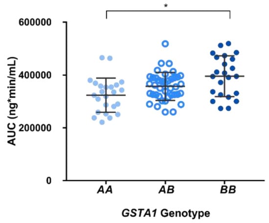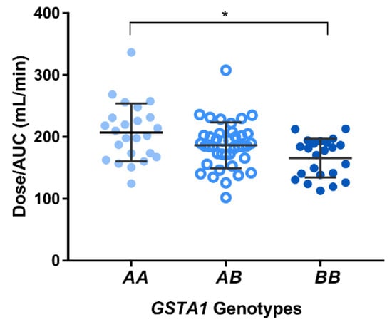 Pharmacokinetic profiles obtained from patients demonstrated that 33/87 (38%) patients reached therapeutic range on the first dose: 12 patients were exhibiting subtherapeutic levels while 42 patients were having supratherapeutic levels. Figure 1 illustrates that higher AUCs were observed in patients with a GSTA1*B*B genotype (395,562 ± 77,083 ng/mL/min) compared to GSTA1*A/*B (357,062 ± 53,100 ng/mL/min) and GSTA1*A/*A patients (323,691 ± 65,906 ng/mL/min; p < 0.001). Hence, carriers of GSTA1*B (n = 64) were significantly associated with lower busulfan CLo compared to wild-type GSTA1*A: 179 ± 36 vs. 207 ± 47 mL/min (p = 0.003). Busulfan CLo among the three genotype groups are illustrated in Figure 2: 166 ± 31, 187 ± 40 and 207 ± 47 mL/min, for GSTA1*B/*B, *A/*B and *A/*A, respectively.