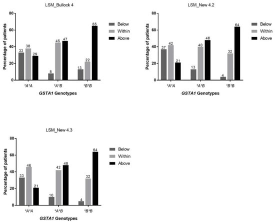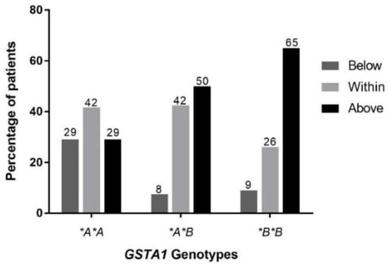 Using the standard AUC method, distribution of patients (%) above the therapeutic range after the first dose was 29% for GSTA1*A/*A, 50% for *A/*B and 65% for *B/*B (Figure 3). Patients with a GSTA1*A/*A genotype were more likely to have achieved therapeutic levels (overall 42%) after the first dose of treatment compared to subjects with a GSTA1*B/*B genotype (26%).