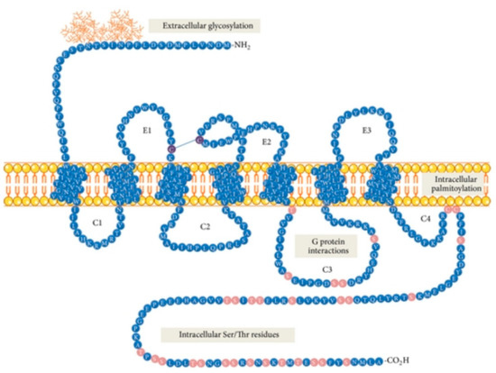 Within the neurokinin receptor family, there are three pharmacologically distinct receptor subtypes: NK1R (TACR1, SPR), NK2R (TACR2) and NK3R (TACR3) [7,8,9]. NK1R is widely expressed in both the CNS and PNS, whereas NK2R is preferentially expressed in PNS [9]. NK1R contains 407 amino acids, and NK2R and NK3R (the longest one) consist of 398 and 465 amino acids, respectively [3]. NK1R exists in two isoforms, as a full-length peptide (NK1R-Fl, Figure 1) and in the truncated isoform (NK1R-Tr), containing 311 amino acids (96 amino acids less at the C-terminus) [3]. NK1R displays two nonstoichiometric binding sites, the more abundant NK-1M (“majority”—representing 80–85% of the total receptor population) and NK-1m (“minority”—so-called “septide sites” or “septide-sensitive”) defined according to the different binding potencies of SP and its analogues [10,11,12,13,14]. NK1R contains an extracellular N-terminus, three extracellular loops (E1, E2 and E3), seven transmembrane domains, three intracellular loops (C1, C2 and C3, as well as a possible C4 loop) and an intracellular C-terminus.