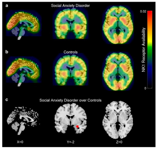 [11C]GR205171 PET/MRI imaging of NK1R occupancy in social anxiety disorder patients (a) and healthy controls (b). Mean PET parametric scans (in colour) of radiotracer were overlaid on MRI images and compared between both groups. Patients with social anxiety disorder showed increased NK1 receptor availability in the right amygdala (c) [156].