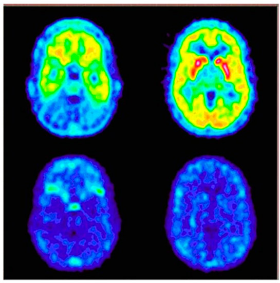 In contrast to SP and its peptide analogues, nonpeptide antagonists are stable and do not follow rapid enzymatic decomposition in vivo. First generation radiotracers were selected from many lead structures, based upon autoradiographic studies of NK1Rs. These compounds were initially investigated in vivo for their ability to be taken up by the brain and other organs in animal models [146,147,148,149] (Figure 4). Early evaluation of [11C]CP-96,345 [146] concluded that despite radioligand high lipophilicity, the cationic form excluded radiotracer passage through the blood–brain barrier and allowed for peripheral tissue imaging only. PET detection of central and peripheral NK1R occupancy was performed later on hamsters using [11C]CP-99,994 [147] and pigs using [11C]CP-643,051 [148]. Both studies confirmed the known autoradiographic mappings. The first primate PET imaging was reported in 2000 at the Uppsala University PET Centre [149], and revealed the uptake kinetics of [11C]GR205171 ([11C]vofopitant) (Figure 5). Research includes regular imaging (baseline study) and imaging with receptor blocked active sites (using unlabelled compound) to demonstrate high specific binding in the striatum, thalamus and neocortex. Tracer analysis showed rapid uptake during 50 min of examination and fast cerebellar nonspecific washout, which introduced the possibility of in vivo assessment of receptor distribution. At the same time, the slow dissociation rate of this tracer from NK1Rs excludes dynamic PET imaging using [11C]GR205171 for physiological receptor regulations. Thereby, the tracer evaluations in human were focused on brain NK1R mapping for further potential clinical application.