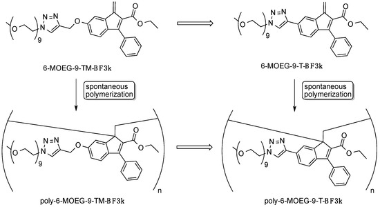 In the aim of evaluating the role of the methylene-oxy spacer in the aggregation features of these PEGylated polybenzofulvene brushes, the structure of 6-MOEG-9-TM-BF3k [24] was manipulated by linking the triazole moiety directly to the position 6 of the indene nucleus of 6-MOEG-9-T-BF3k (Figure 2) and the resulting benzofulvene monomer was induced to polymerize spontaneously in the apparent absence of initiators and/or catalyst by removal of the solvent to afford PPBFP derivative poly-6-MOEG-9-T-BF3k.