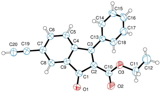 Single crystals of indenone derivative 3 were used in X-ray data collection on an Oxford-Diffraction Xcalibur Sapphire 3 diffractometer (Santa Clara, CA, USA) equipped with a graphite monochromated Mo Kα radiation (λ = 0.71073 Å) at 293 K. The direct methods implemented in SHELXS-2013 program were used in the solution of the structures [37]. The refinements were carried out by full-matrix anisotropic least-squares on F2 for all reflections for non-H atoms by means of the SHELXL-2018 program [38]. Crystallographic data (excluding structure factors) for the structure in this paper have been deposited with the Cambridge Crystallographic Data Centre as supplementary publications no. CCDC 1901307 (Supplementary Materials). Copies of the data can be obtained, free of charge, on application to CCDC, 12 Union Road, Cambridge CB2 1EZ, UK; (fax: +44 (0) 1223 336 033; or e-mail: deposit@ccdc.cam.ac.uk).