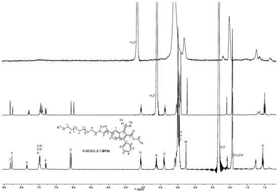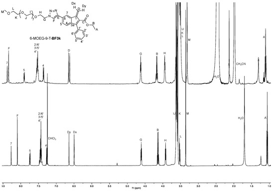 The 1H NMR spectroscopic features of benzofulvene monomer 6-MOEG-9-T-BF3k were studied in different deuterated organic solvents, namely chloroform and acetonitrile (Figure 4 and Figure 5).