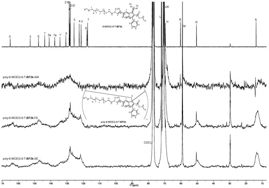 Comparison of the 13C NMR spectrum of monomer 6-MOEG-9-T-BF3k (125 MHz, CDCl3, top trace) with those of the corresponding polymers: poly-6-MOEG-9-T-BF3k-WA, poly-6-MOEG-9-T-BF3k-FE, and poly-6-MOEG-9-T-BF3k-SE.