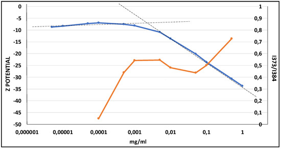 I373/I384 intensity ratio obtained from pyrene emission spectra in the presence of poly-6-MOEG-9-T-BF3k-FE (blue curve) and Z-potential values (orange curve) as a function of polymer concentration.